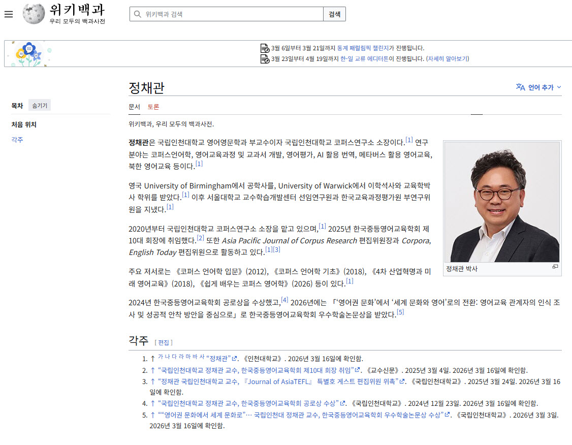 003. 인천광역시 연수구청 연수마을 TV <정채관 교수와 신나는 영어 산책> 프로그램 진행자 (2021.11~2021.12).